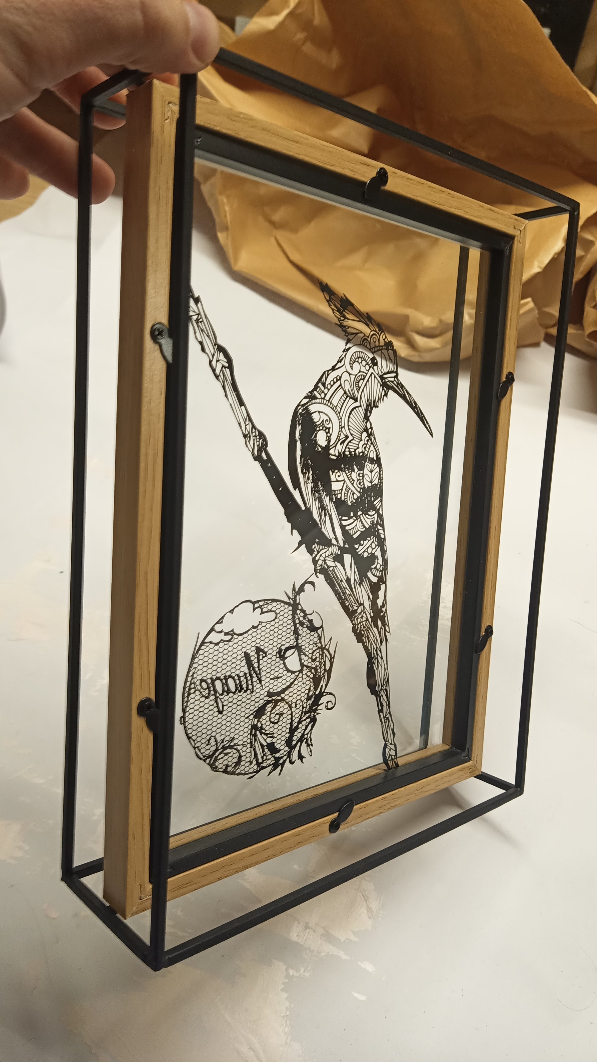 Papier découpé encadré entre deux verres